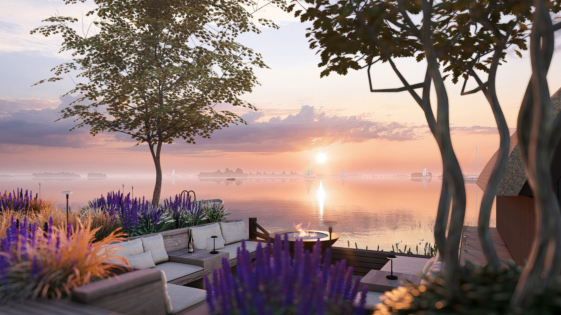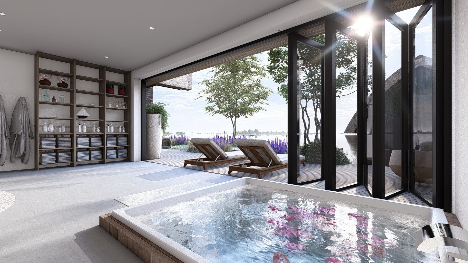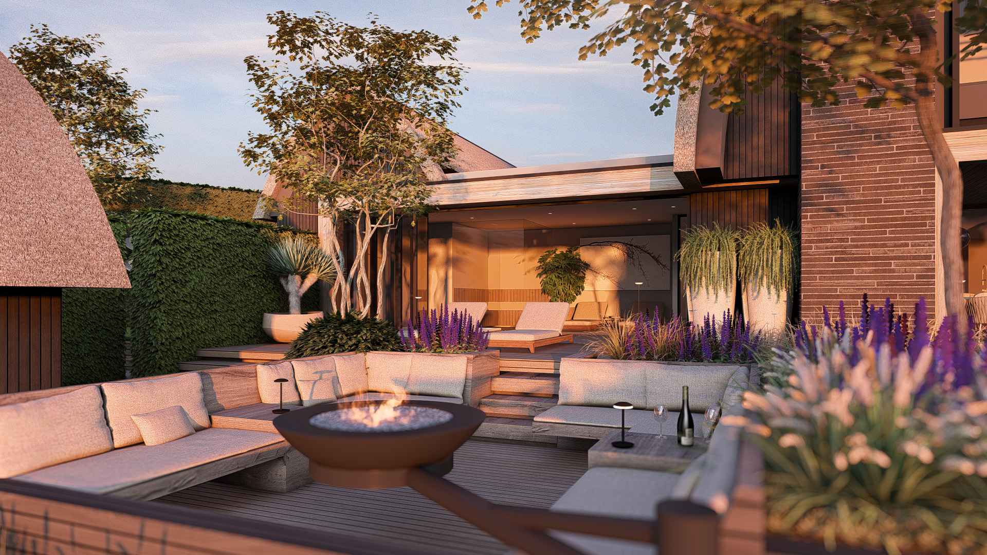 Prachtige tuin met zitkuil aan het water en wellness gedeelte.