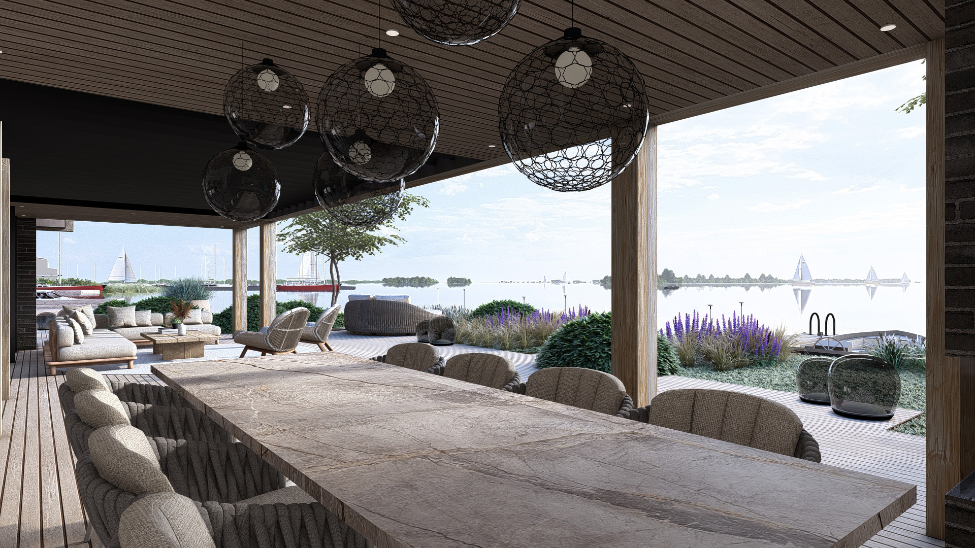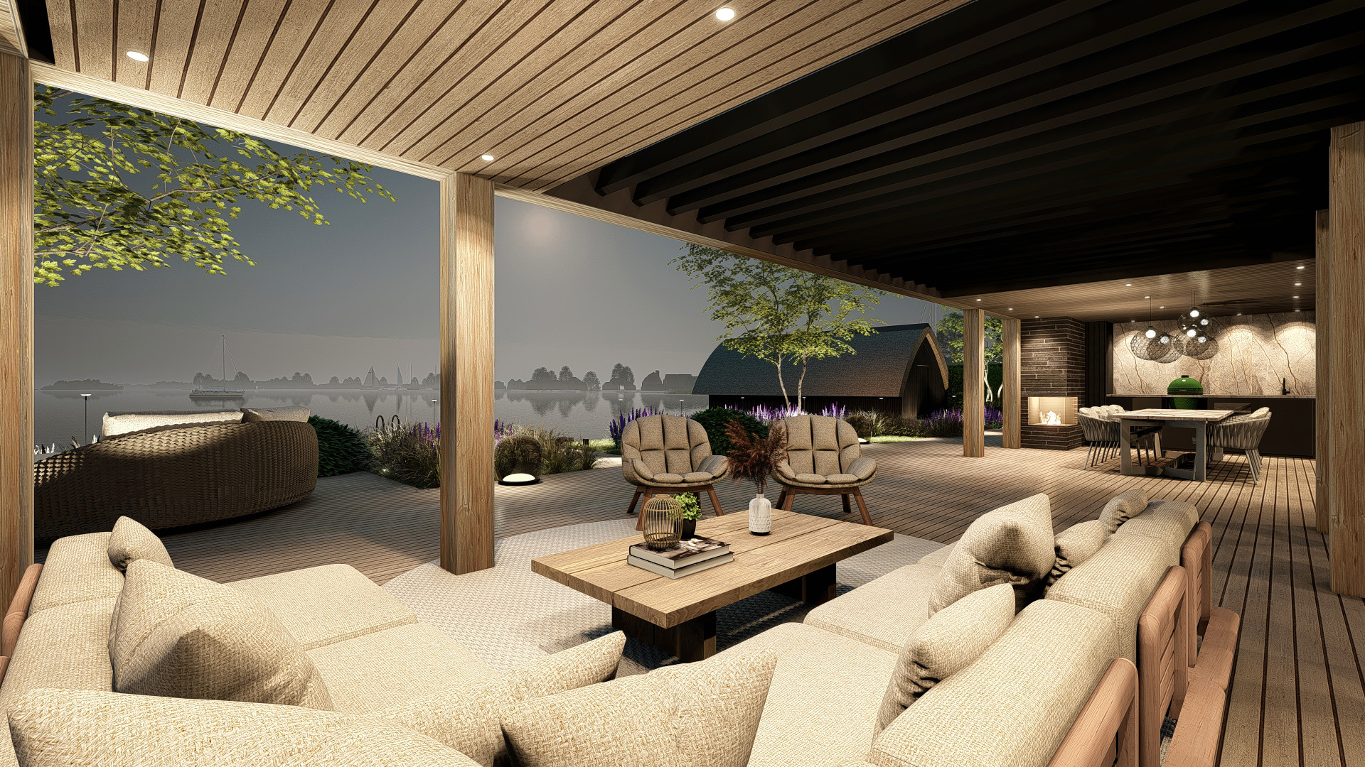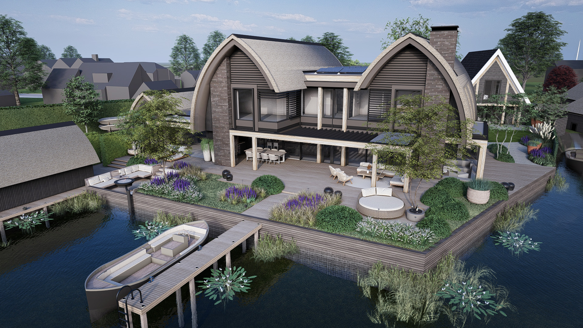 Prachtige tuin met zitkuil aan het water en wellness gedeelte.